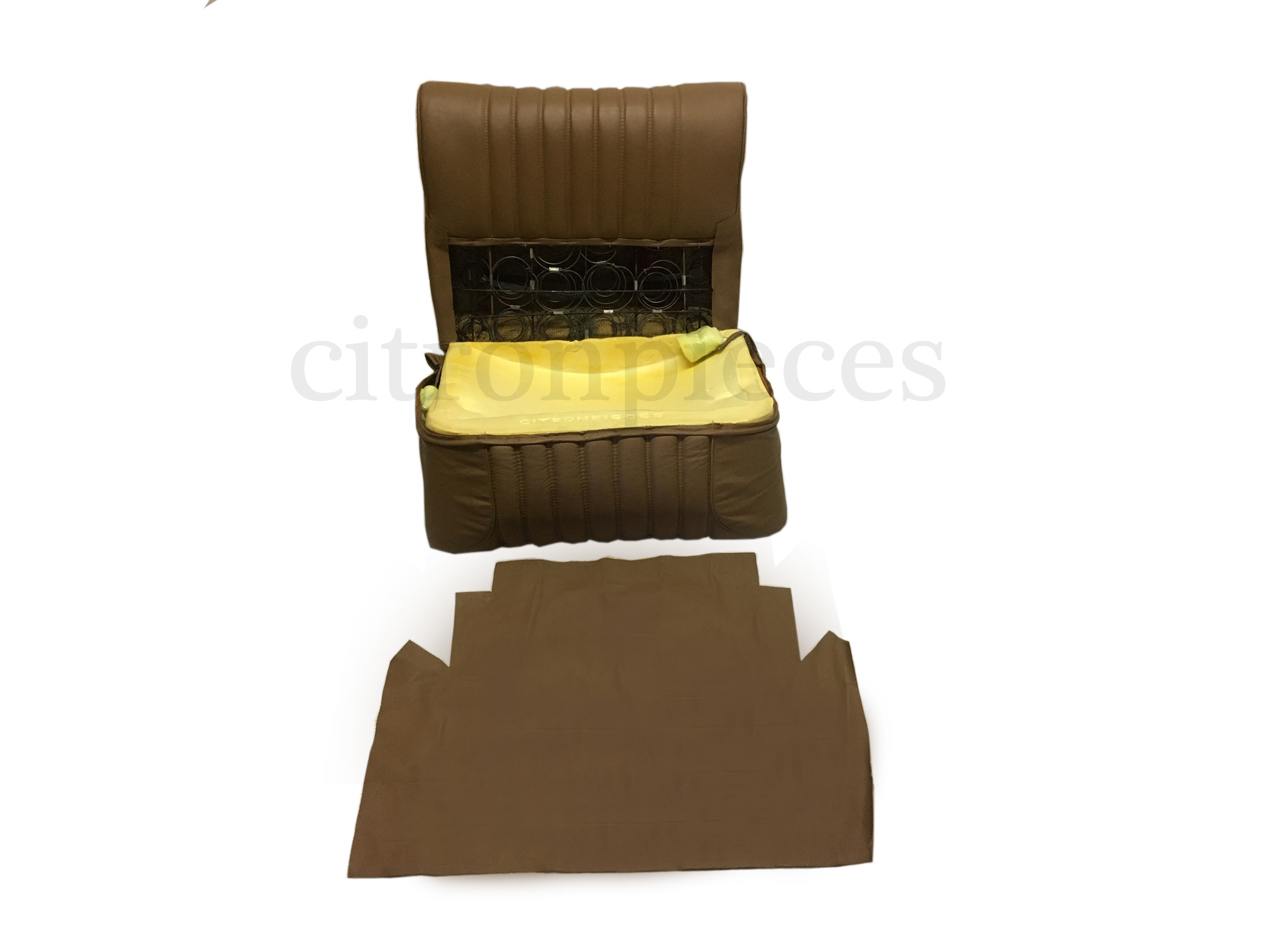 Back of front seat with metal springs, prepared for narrow headrests, for leather, model with turn knob, including back piece, trimmed in dark brown leather,.