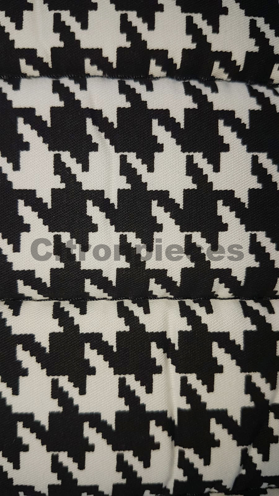 2CV Set van 2 voorstoelhoezen (1 ronden hoek-assym) en 1 achterbank "pied de poule" (zwart wit) met zwart skai zijkanten. Charleston Citroën 2CV. - Copy